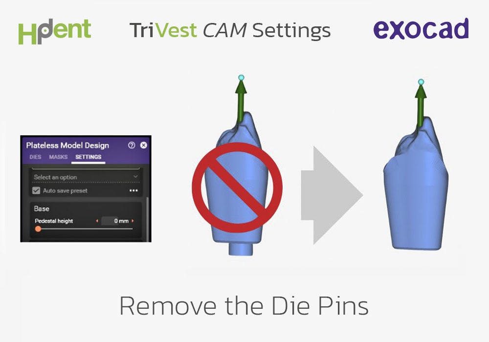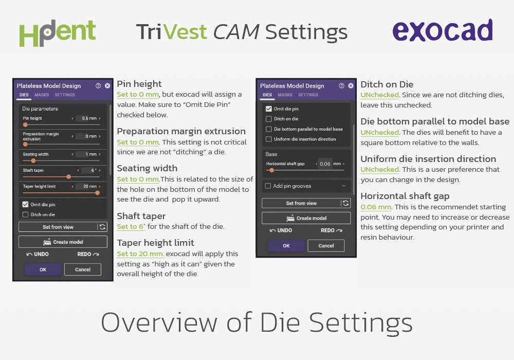 - Un espacement de 0,04 mm d’écart horizontales autour des dies, est un bon point de départ et peut nécessiter un ajustement en fonction de l’imprimante 3D, de la résine et du post-traitement utilisés.
