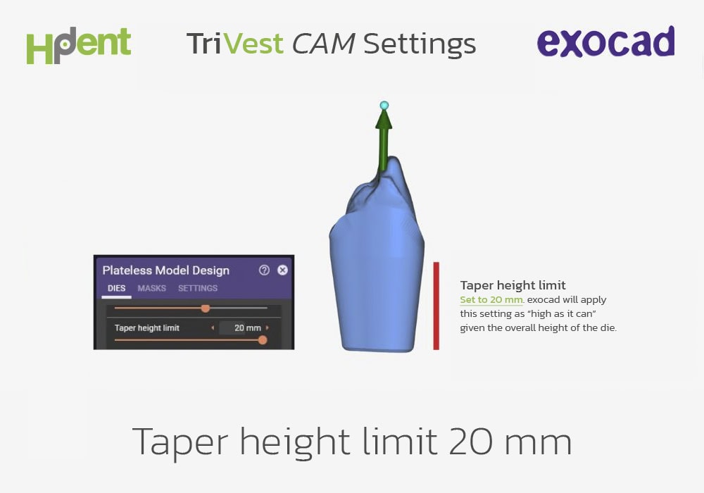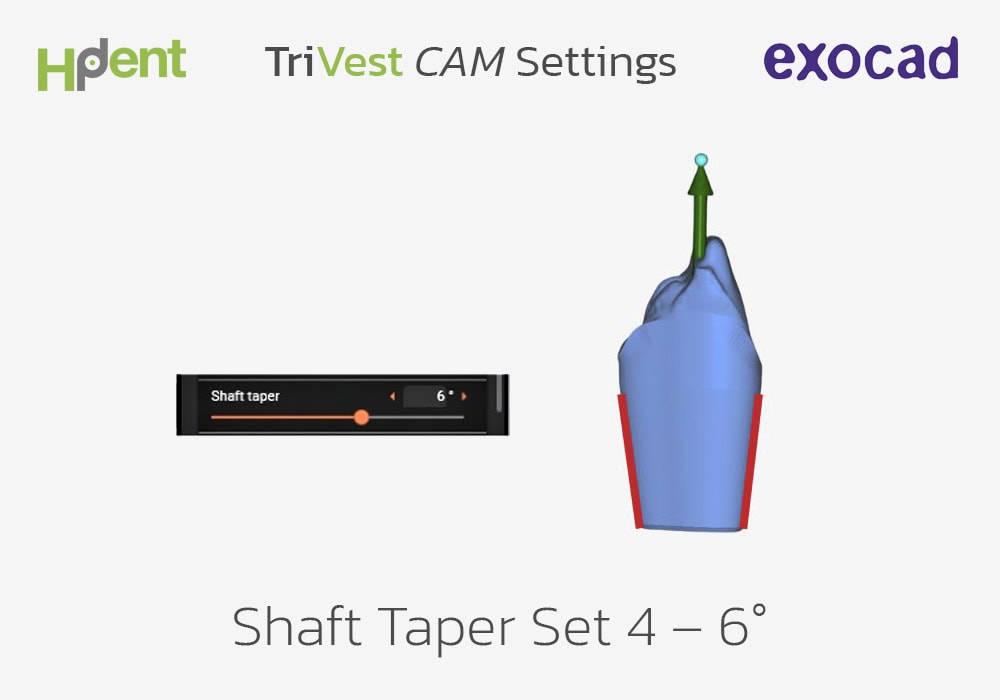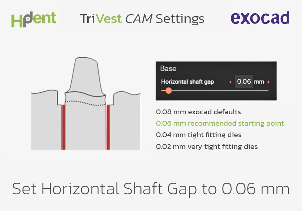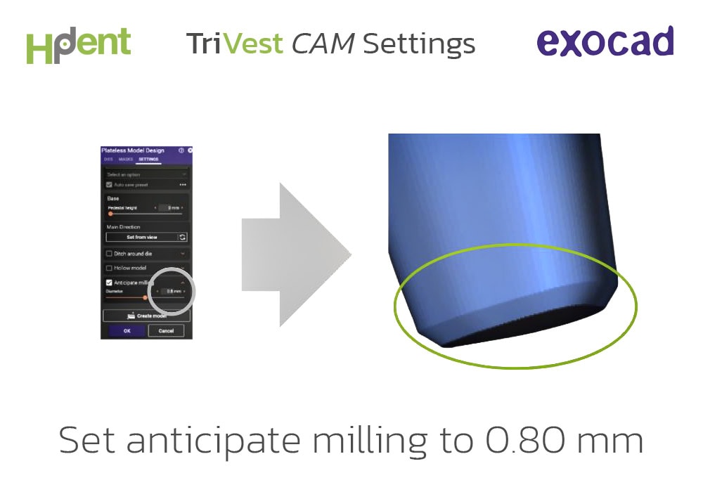 - Mill TriVest CAM with a ZrO₂ strategy / 1-1 ratio (there is no shrinkage factor). We suggest gentle / soft milling mode which usually offers a reduced feed rate. → Alternatively, use a composite or wax strategy allowing to mill without shrinkage factor.