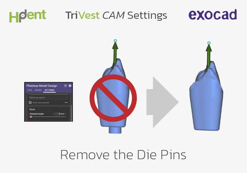 - Fraisez TriVest CAM avec une stratégie ZrO₂ 1:1 (sans facteur d’agrandissement). Nous recommandons un mode de fraisage doux avec une vitesse d’usinage réduite. → Vous pouvez également utiliser une stratégie composite ou cire pour fraiser sans facteur de retrait..