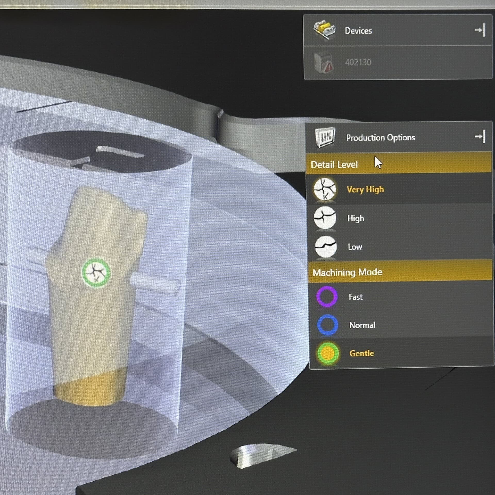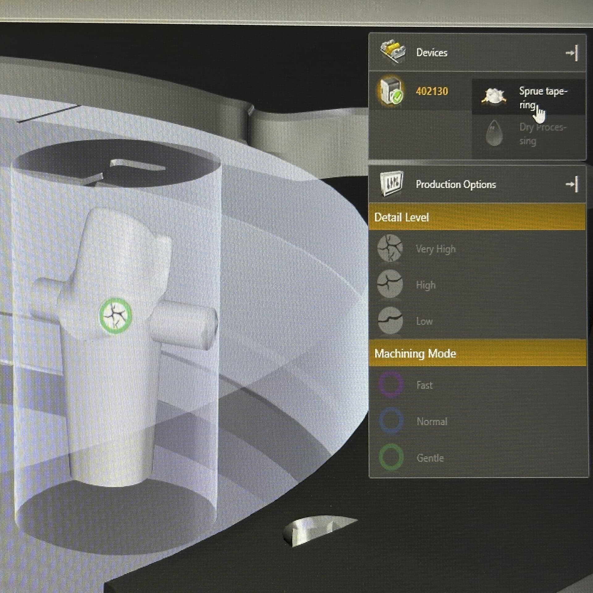 - Fresare TriVest CAM con strategia ZrO₂ / rapporto 1-1 (non c‘è fattore di contrazione). Si consiglia la modalità di fresatura delicata/gentile, che di solito offre una velocità di avanzamento ridotta. → In alternativa, è possibile utilizzare la strategia composito o cera, che consente la fresatura senza fattore di contrazione.